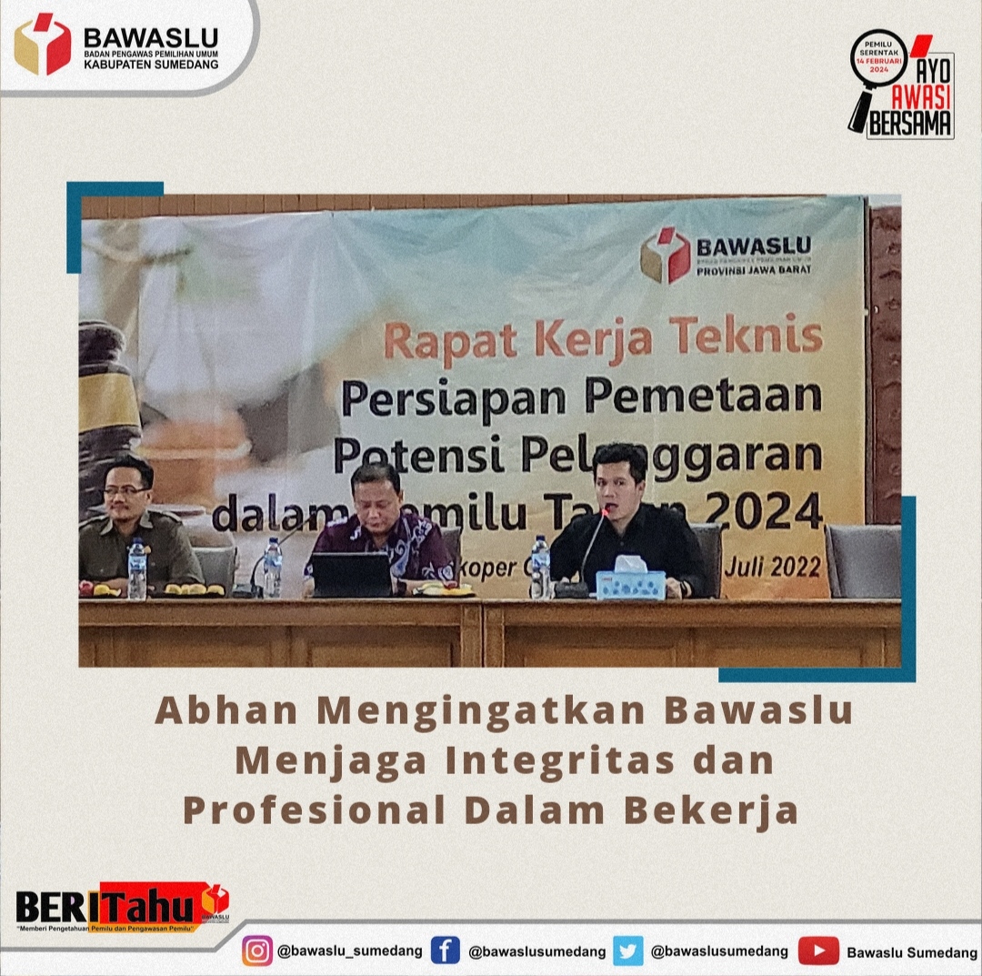 Dalam acara tersebut menghadirkan narasumber ketua Bawaslu RI periode 2017-2022 Abhan. Menurunya, kita secara tugas kelembagaan sudah memiliki pengalaman pada pemilu dan pilkada yang sudah dilaksanakan, sehingga semuanya bisa merumuskan apa yang menjadi potensi terjadinya dugaan pelanggaran.