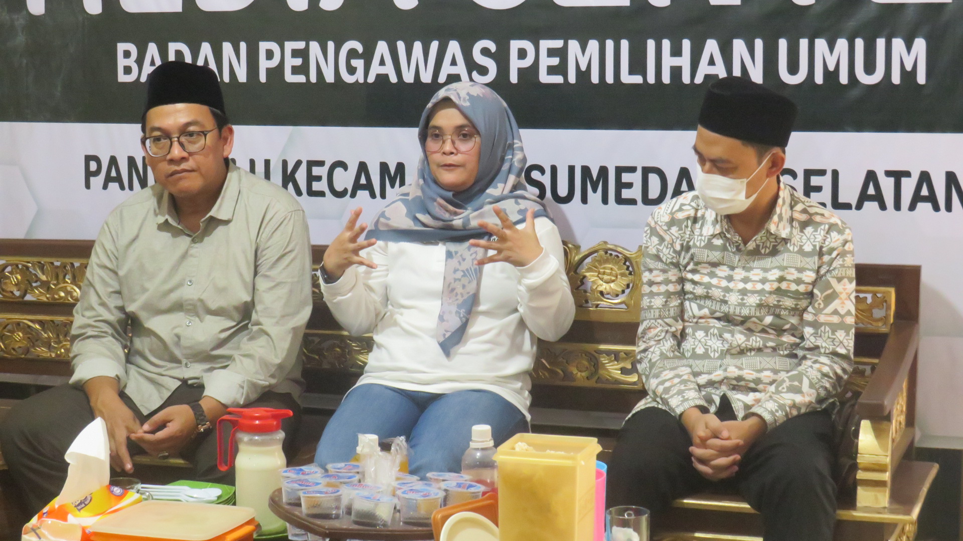 Anggota Bawaslu Republik Indonesia Lolly Suhenty bertemu dengan jajaran pengawas pemilu kecamatan di kantor sekretariat Panwascam Kecamatan Sumedang Selatan. Minggu, 30 April 2023.