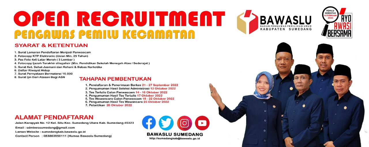 Informasi pengumuman pendaftaran seleksi Panwascam pemilu tahun 2024 silahkan untuk memantau media sosial dan website Bawaslu Kabupaten Sumedang serta dapat juga langsung datang ke Kantor Bawaslu Kabupaten Sumedang.