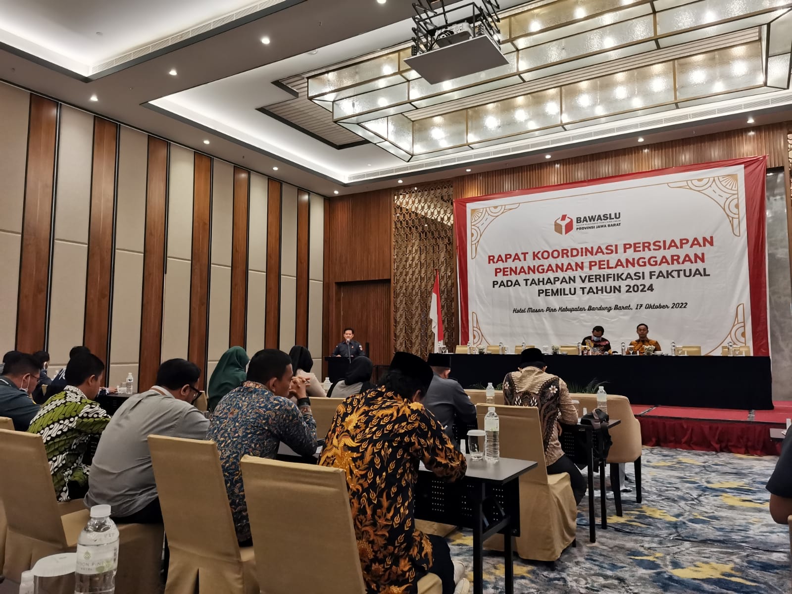Kordinator divis Penanganan Pelanggaran Ade Sunarya, M.Pd., M.H beserta jajaran staf sekretariat menghadiri undangan Rapat Koordinasi persiapan penanganan pelanggaran tahapan verifikasi faktual dari Bawaslu Provinsi Jawa Barat bertempat di Hotel Mason Pine Kabupaten Bandung Barat. Senin (17/10/2022)