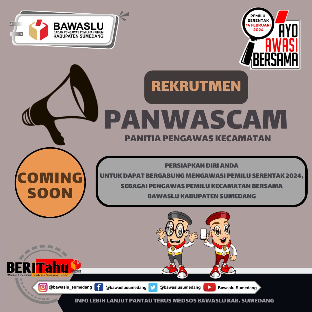Coming Soon Rekrutmen Panwascam humas | Rabu, Agustus 24, 2022 - 10:17 Tag Pengumuman Share Berita Terkini humas Kamis, Desember 11, 2025 - 15:12 Bawaslu Sumedang Perkuat Implementasi Program Jum'at Sehati dan Jumpa Berlian humas Senin, Desember 8, 2025 - 17:06 Kawal Akurasi Data Pemilih, Bawaslu Sumedang Awasi Pleno PDPB Triwulan IV humas Rabu, Desember 3, 2025 - 10:52 Bawaslu Sumedang Sambangi KPU Sumedang Pastikan Pemutakhiran Data Pemilih Berkelanjutan Lihat Lainnya