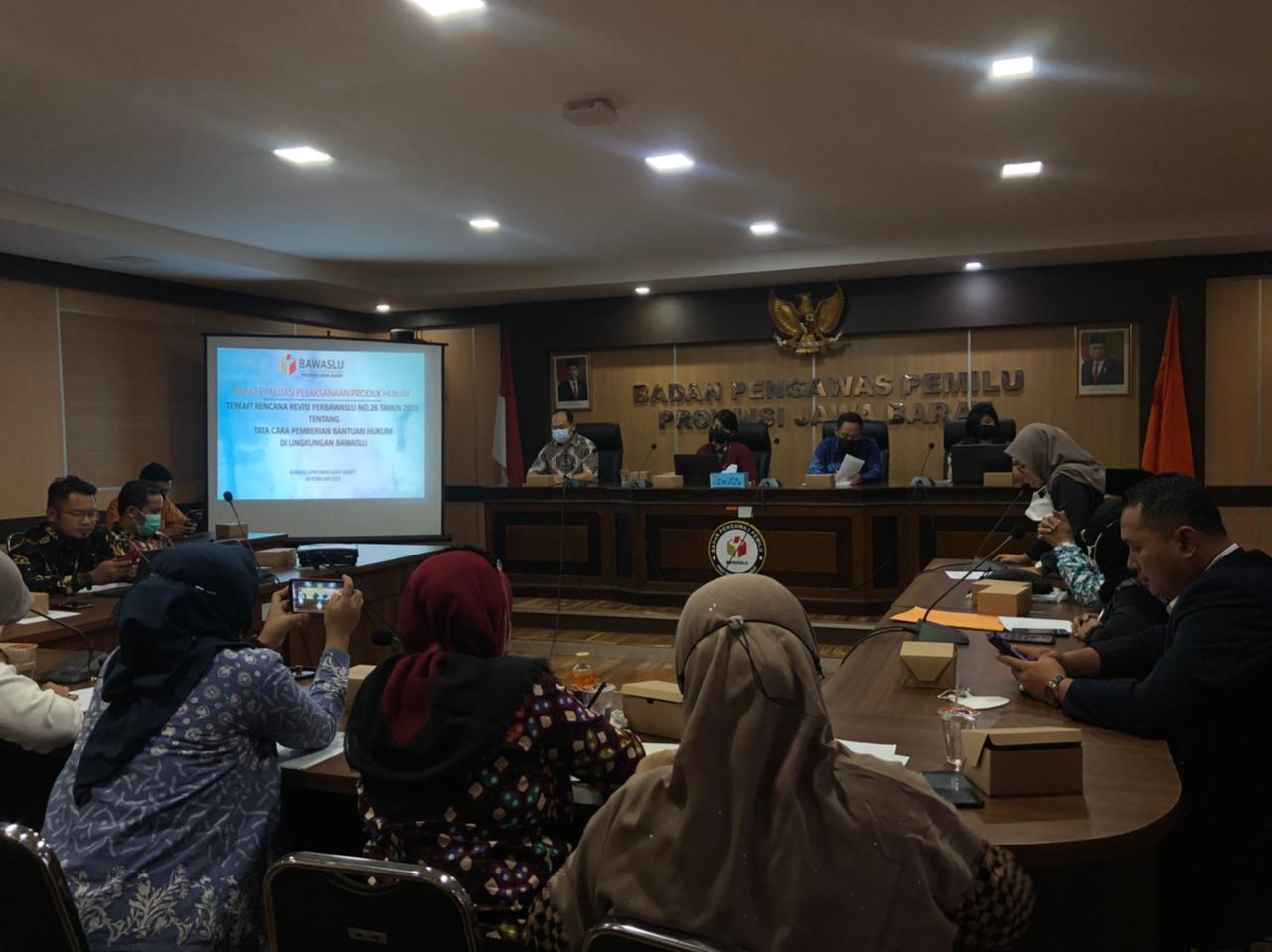 Rapat "Evaluasi Produk Hukum Terkait Rencana Revisi Peraturan Bawaslu Nomor 26 Tahun 2018 tentang Tata Cara Pemberian Bantuan Hukum di Lingkungan Badan Pengawas Pemilihan Umum”, persiapan tahapan Pemilihan dan Pilkada serentak 2024. Kantor Bawaslu Provinsi Jawa Barat, Kamis, 10/02/2022.[/caption]