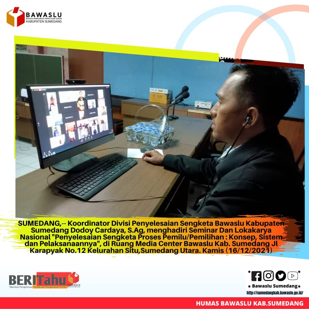 SUMEDANG,-- Koordinator Divisi Penyelesaian Sengketa Kabupaten Sumedang Dodoy Cardaya, S.Ag, menghadiri dan mengikuti Seminar Dan Lokakarya Nasional "Penyelesaian Sengketa Proses Pemilu/Pemilihan : Konsep, Sistem dan Pelaksanaannya", di Ruang Media Center Bawaslu Kab. Sumedang Jl Karapyak No.12 Kelurahan Situ,Sumedang Utara. Kamis (16/12/2021).
