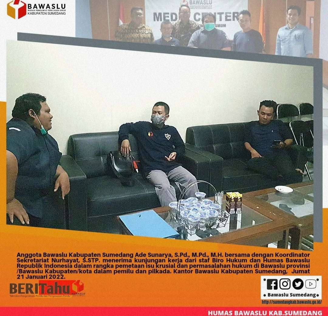 Sumedang,-- Anggota Bawaslu Kabupaten Sumedang Ade Sunarya, S.Pd.,M.Pd.,MH, bersama koordinator sekretariat Nurhayat, S.STP, menerima kunjungan dari staf biro hukum dan humas Bawaslu Republik Indonesia di kantor sekretariat Bawaslu Kabupaten Sumedang. Jum'at (21/01/2022).