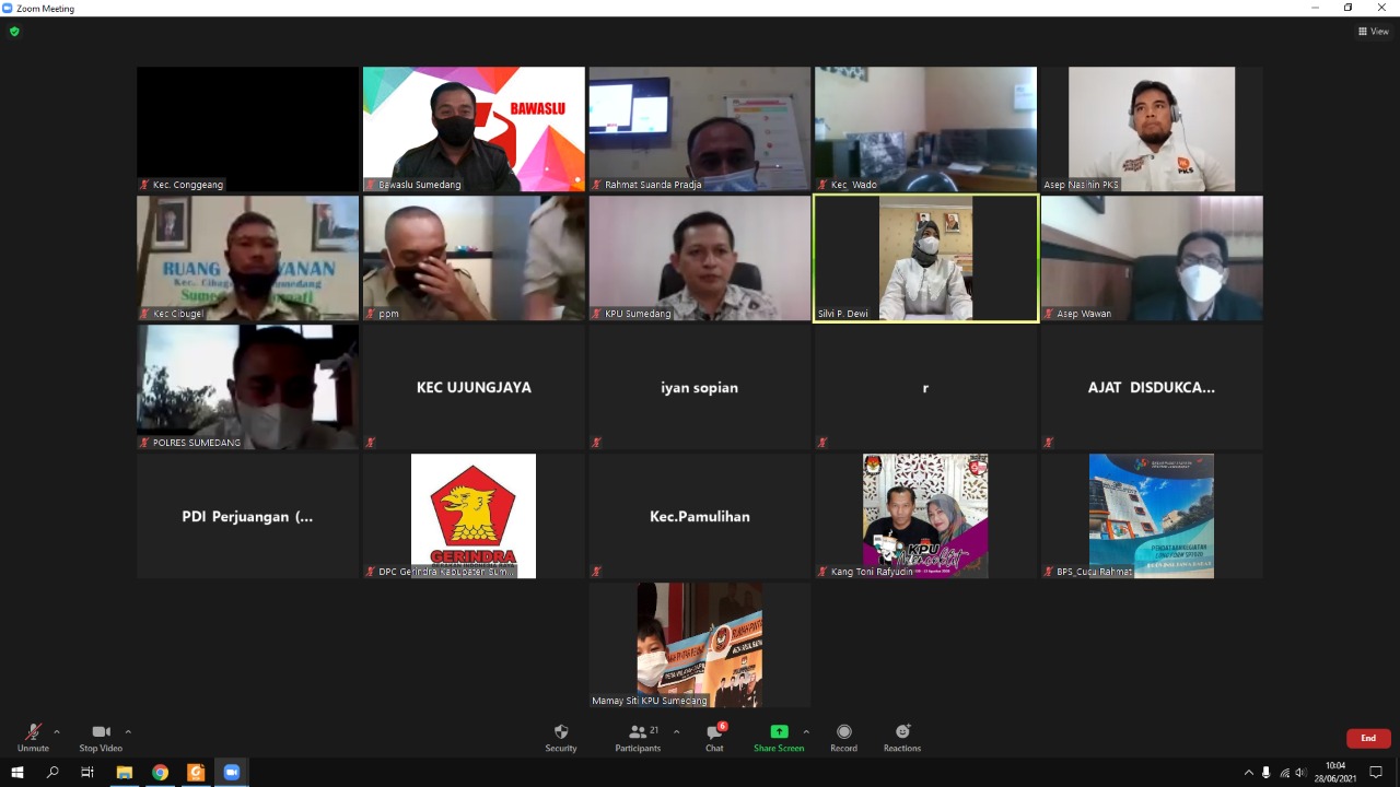 Sumedang, Bawaslu Kabupaten Sumedang kembali menghadiri Undangan Rapat Koordinasi Daftar Pemilih Berkelanjutan Tahun 2021 Periode Bulan Juni dari KPU Kabupaten Sumedang secara daring pada hari Senin (28/6/2021). Pimpinan dan Staf Bawaslu Sumedang turut hadir mengawasi jalannya acara yang dihadiri oleh Anggota KPU , perwakilan Dinas Kependudukan dan Pencacatan Sipil Kantor Kesatuan Bangsa dan Politik , Kepolisian Resor Sumedang, KODIM 0610 Sumedang, BPS Sumedang, Cabang Dinas Pendidikan Wilayah VIII Provinsi Jawa Barat, Camat Se Kabupaten Sumedang, APDESI,PPDI dan perakilan Partai Politik.