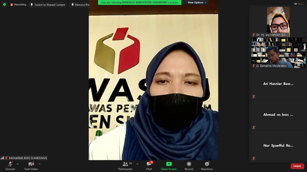 Sumedang, Pimpinan Bawaslu Kabupaten Sumedang mengikuti kegiatan SADIDA (Safari Diskusi Daring) yang diselenggarakan oleh Bawaslu Kabupaten Sukabumi, tema pada kegiatan daring ini yakni, kesiapan SDM (Sumber Daya Manusia) Pengawas Pemilu dalam Penggunaan Teknologi Informasi di Pemilu dan Pemilihan 2024. (12/08/2021)