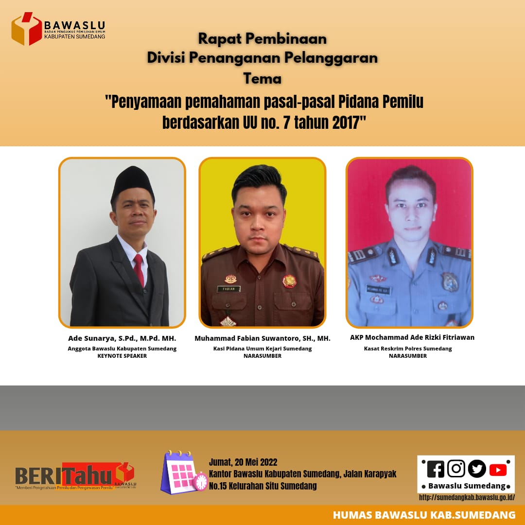 Rapat Pembinaan terkait Penyamaan Pemahaman Pasal-pasal Pidana Pemilu berdasarkan UU No. 7 Tahun 2017 tentang Pemilihan Umum humas | Jumat, Mei 20, 2022 - 12:45 Tag Pengumuman Share Berita Terkini humas Kamis, Desember 11, 2025 - 15:12 Bawaslu Sumedang Perkuat Implementasi Program Jum'at Sehati dan Jumpa Berlian humas Senin, Desember 8, 2025 - 17:06 Kawal Akurasi Data Pemilih, Bawaslu Sumedang Awasi Pleno PDPB Triwulan IV humas Rabu, Desember 3, 2025 - 10:52 Bawaslu Sumedang Sambangi KPU Sumedang Pastikan Pemutakhiran Data Pemilih Berkelanjutan Lihat Lainnya