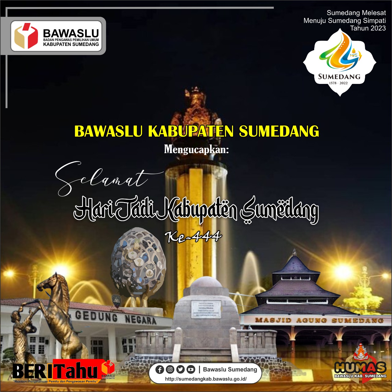 Selamat Hari Jadi Kabupaten Sumedang ke-444 humas | Jumat, April 22, 2022 - 10:49 "Sumedang Melesat Menuju Sumedang Simpati 2023" Tag Pengumuman Share Berita Terkini humas Kamis, Desember 11, 2025 - 15:12 Bawaslu Sumedang Perkuat Implementasi Program Jum'at Sehati dan Jumpa Berlian humas Senin, Desember 8, 2025 - 17:06 Kawal Akurasi Data Pemilih, Bawaslu Sumedang Awasi Pleno PDPB Triwulan IV humas Rabu, Desember 3, 2025 - 10:52 Bawaslu Sumedang Sambangi KPU Sumedang Pastikan Pemutakhiran Data Pemilih Berkelanjutan Lihat Lainnya