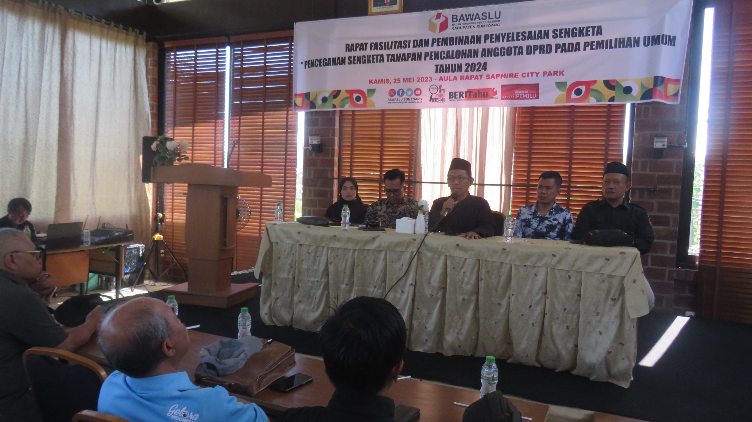 Sumedang, Badan Pengawas Pemilihan Umum (Bawaslu) Kabupaten Sumedang melaksanakan Rapat Fasilitasi dan Pembinaan Penyelesaian Sengketa dengan tema “ Pencegahan Sengketa Tahapan Pencalonan anggota DPRD pada pemilihan umum tahun 2024. Kegiatan dihadiri oleh pimpinan Bawaslu Provinsi Jawa Barat Yulianto, SH., MH. dan Anggota Bawaslu Kabupaten Sumedang. Sementara itu peserta datang dari partai politik peserta pemilu tahun 2024 serta pemantau pemilu.