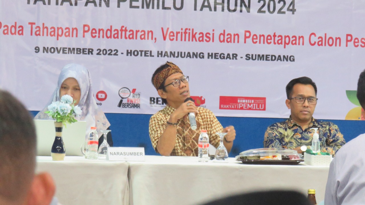 Menghadirkan narasumber dari Koordinator Divisi Penyelesaian Sengketa Bawaslu Jawa Barat, Yulianto, M.H, Ketua KPU Kabupaten Sumedang, Ogi Ahmad Fauzi, M.Si, akademisi yang merupakan dosen UIN Sunan Gunung Djati Bandung, Dr. Hj, Dede Kania, M.H, dan praktisi hukum Bambang Sugiran, M.H merupakan Ketua PERADI Sumedang.