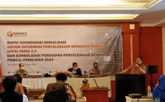 [caption id="attachment_1055" align="aligncenter" width="720"] Anggota Bawaslu RI Rahmat Bagja (mimbar) memberikan sambutan dan arahan dalam acara "Rapat Koordinasi Sosialisasi Sis
